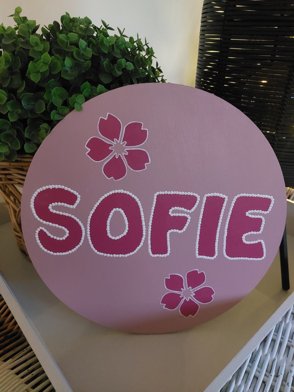Deze prachtige ronde muurcirkel van MDF is handbeschilderd en staat erg leuk in de kinderkamer! Naast de naam, die uiteraard in diverse kleuren kan worden geschilderd, is de cirkel opgeleukt met 2 schattige bloemetjes. De naam en de bloemen zijn afgewerkt met een mooie witte stippeltechniek.