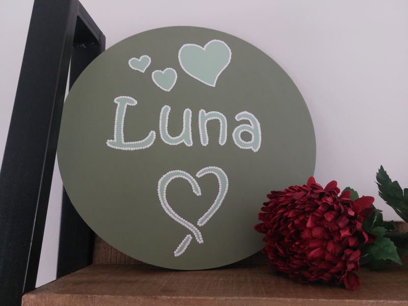 Deze prachtige ronde muurcirkel van MDF is handbeschilderd en staat erg leuk in de kinderkamer! Naast de naam, die uiteraard in diverse kleuren kan worden geschilderd, is de cirkel opgeleukt met schattige hartjes. De naam en de hartjes zijn afgewerkt met een mooie witte stippeltechniek.