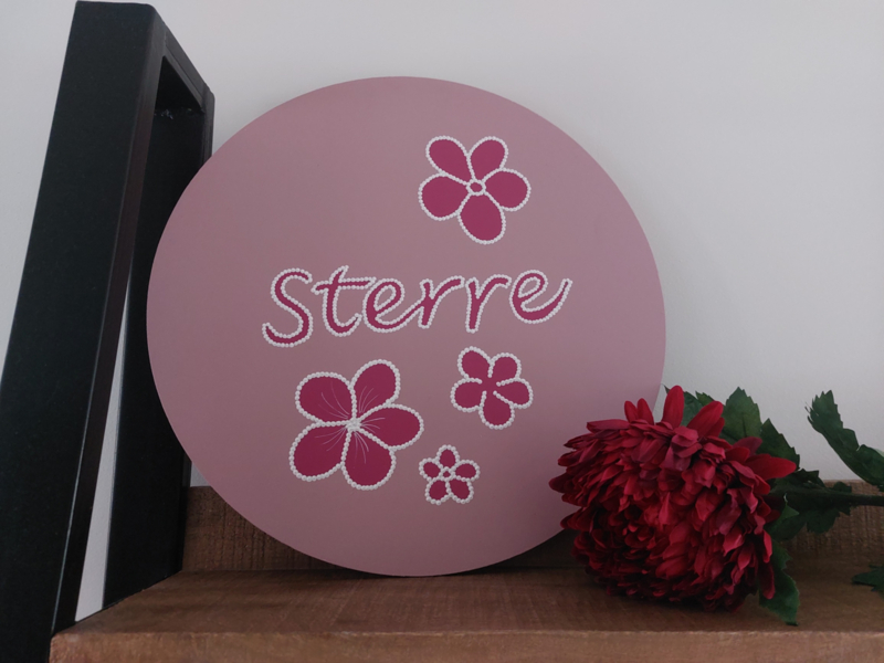 Deze prachtige ronde muurcirkel van MDF is handbeschilderd en staat erg leuk in de kinderkamer! Naast de naam, die uiteraard in diverse kleuren kan worden geschilderd, is de cirkel opgeleukt met schattige bloemetjes. De naam en de bloemetjes zijn afgewerkt met een mooie witte stippeltechniek.