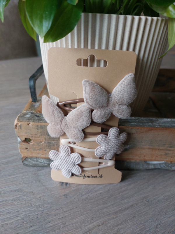 Haarspeldjes BoukjeDeze set bestaat uit 4 haarclips in bruine en beige tinten, opgevrolijkt met zachte vlinders en geribte bloemen. Beide setjes zijn gemaakt van gekleurde metalen clips.