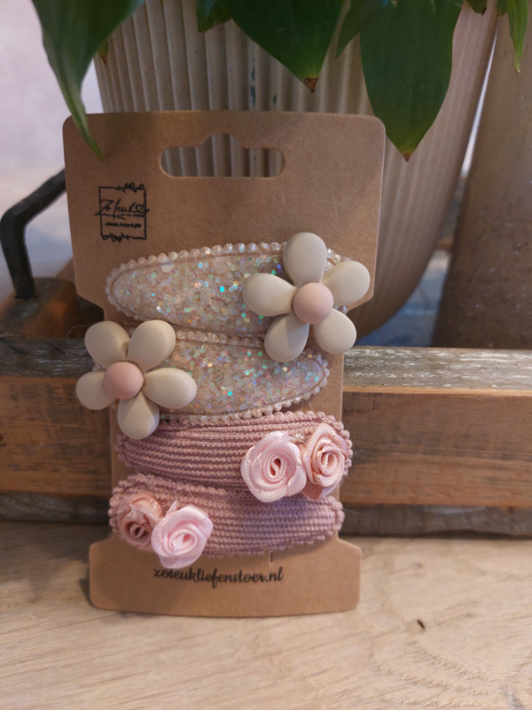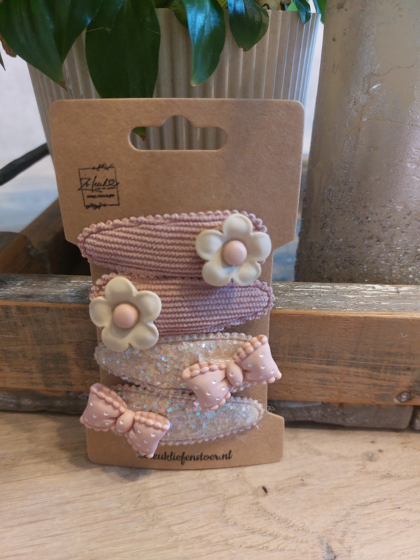 Haarspeldjes MillieDeze giftset bestaat uit 4 haarclips in zachtroze en beige tinten, opgevrolijkt met mooie bloemetjes en schattige strikjes. De ene set heeft mooie glitterclips en de andere set roze geribte.
