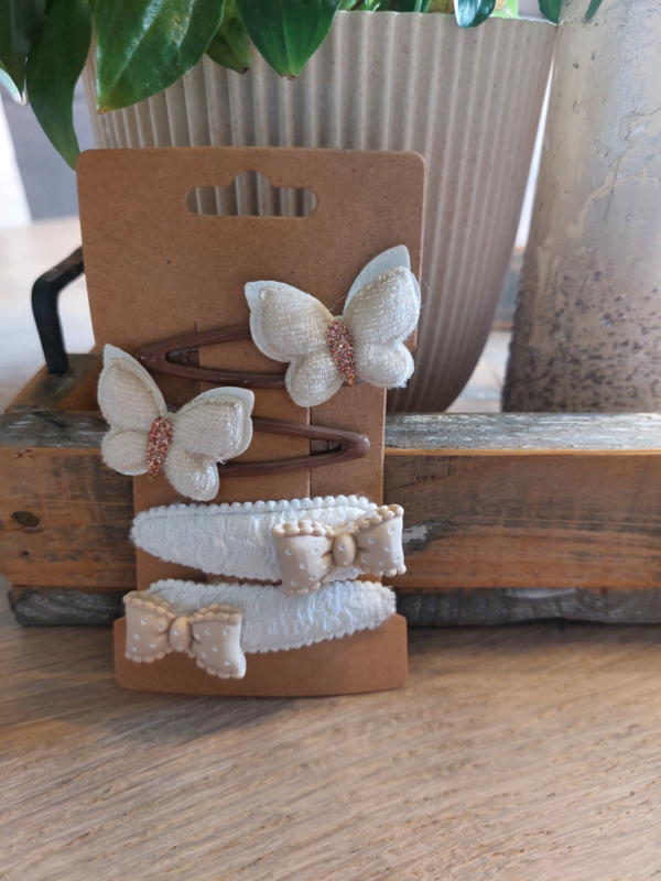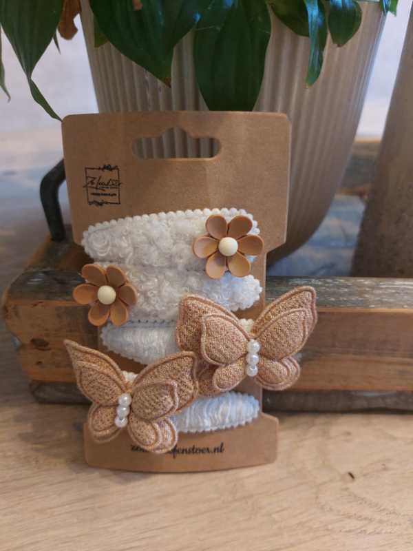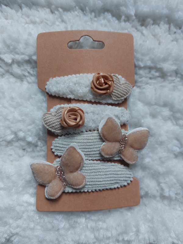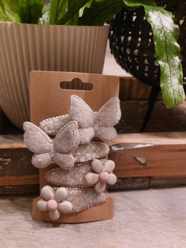 Haarspeldjes EsmeeDeze set bestaat uit 4 haarclips in neutrale beige/taupe tinten, opgevrolijkt met mooie vlinders en schattige bloemetjes. Een setje heeft teddy clips en het tweede setje heeft glitterclips.