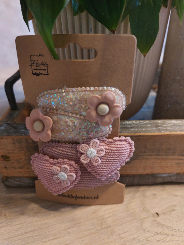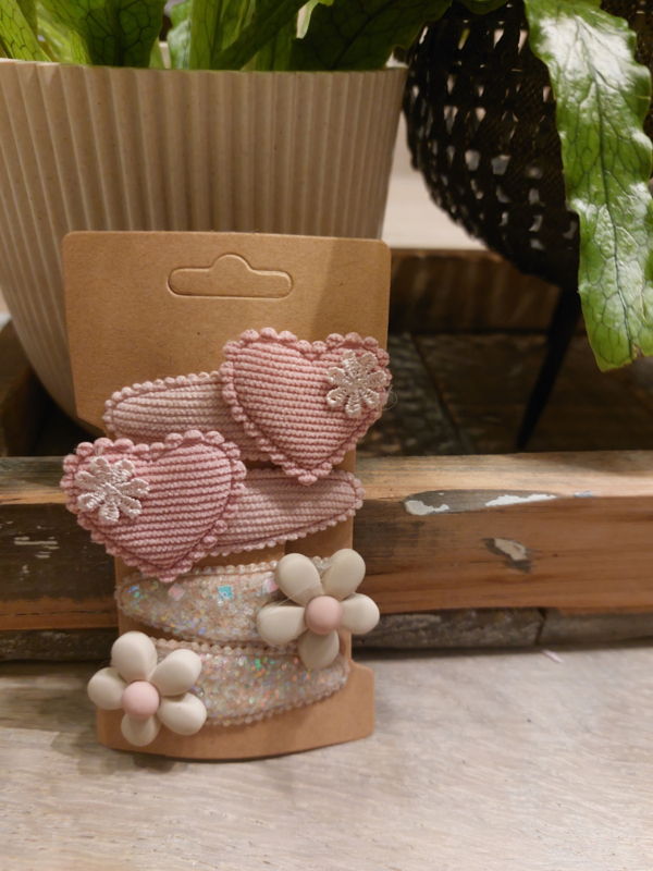 Haarspeldjes JinteDeze set bestaat uit 4 haarclips in taupe en roze tinten, opgevrolijkt met hartjes en schattige bloemetjes. De ene set heeft roze rib clips en het tweede setje heeft glitter clips. De clips zijn ca. 5 cm.