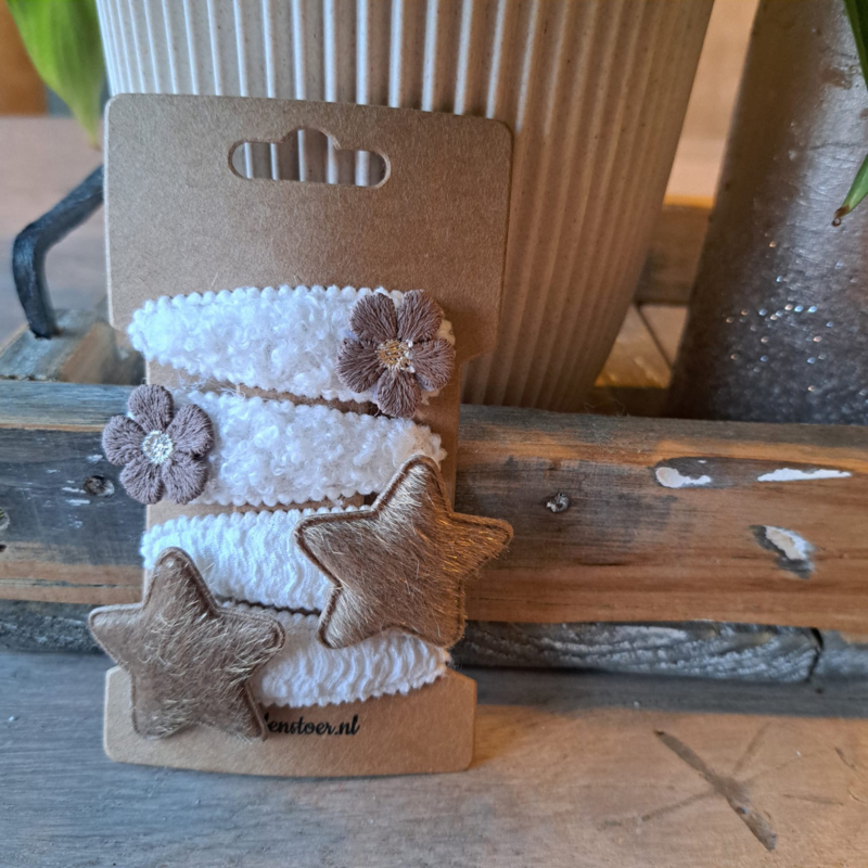 Haarspeldjes BibiDeze giftset bestaat uit 4 haarclips in bruine en off-white tinten, opgevrolijkt met mooie bloemetjes en stoere sterren. De applicaties hebben een subtiele goudkleur-toevoeging.