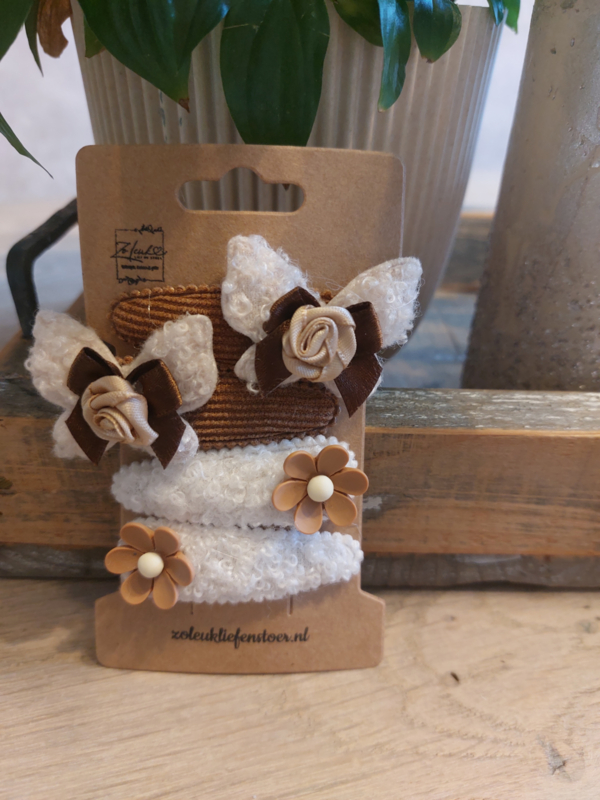 Haarspeldjes BibiDeze set bestaat uit 4 haarclips in bruine en beige tinten, opgevrolijkt met mooie vlinders en schattige bloemetjes. De clips zijn ca. 5 cm. Het ene setje heeft zachte teddy clips en de andere set heeft stoere rib clips.