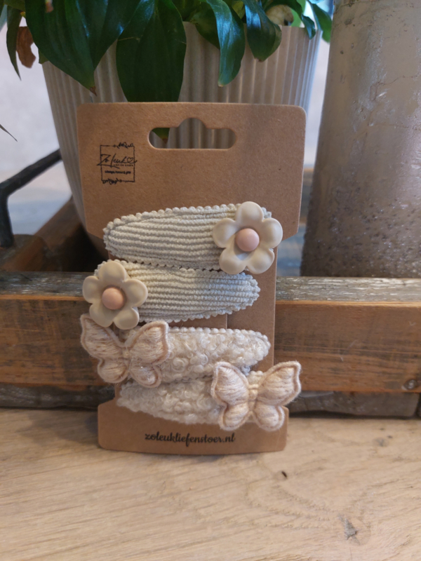 Haarspeldjes FleurDeze giftset bestaat uit 4 haarclips in beige tinten, opgevrolijkt met mooie bloemetjes (met een tikkie roze) en schattige fluffy vlinders. De ene set heeft teddy clips en de andere set stoere geribte.