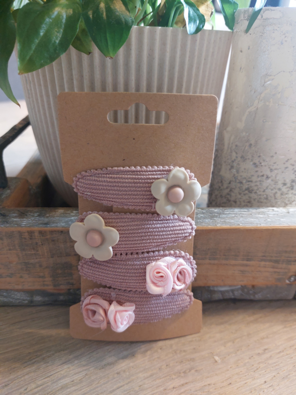 Haarspeldjes BloemDeze giftset bestaat uit 4 haarclips van ribstof in roze en beige tinten, opgevrolijkt met schattige bloemetjes. De clips zijn ca. 5 cm.