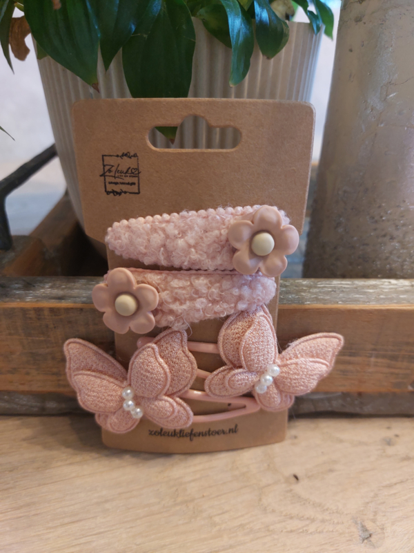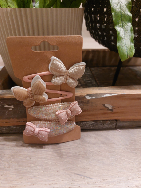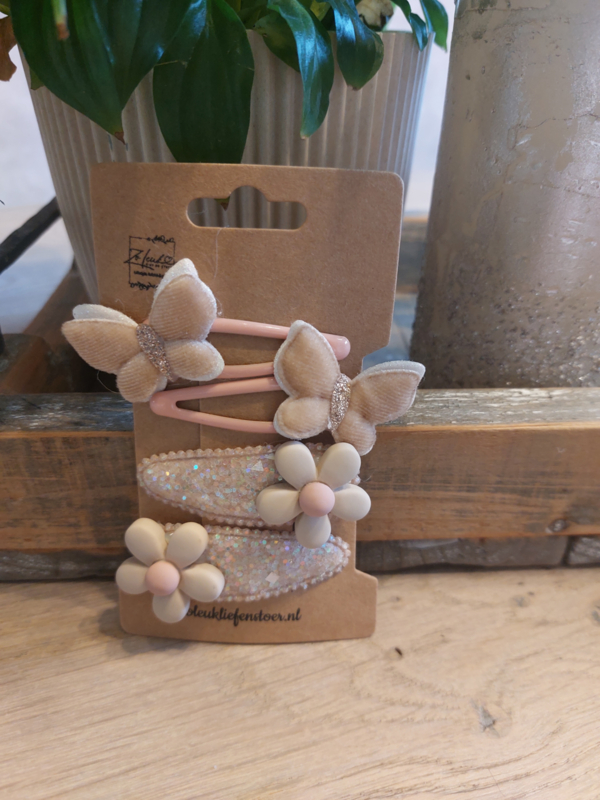 Haarspeldjes SteffieDeze giftset bestaat uit 4 haarclips in zachtroze en beige tinten, opgevrolijkt met mooie bloemetjes en schattige vlinders. De ene set heeft mooie glitterclips en de andere set roze metalen clips.