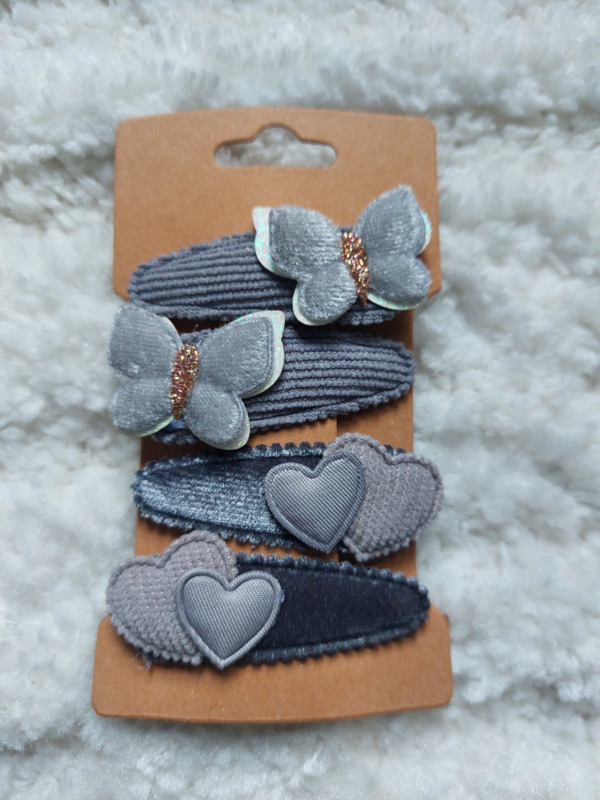 Haarspeldjes IzeDeze set bestaat uit 4 haarclips in grijze tinten, opgevrolijkt met mooie vlinders en lieve hartjes. De clips zijn ca. 5 cm. Het ene setje heeft zachte fluwelen clips en de andere set heeft stoere rib clips.